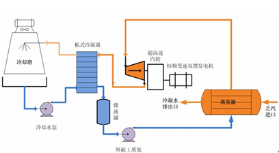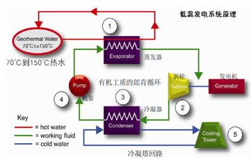 -提供基荷、再生、清潔的電力; -對原先沒有利用價值的中低溫地熱資源提供發(fā)電能力; -大批量生產(chǎn)制造, 縮短交貨期及提高用戶投資回報; -高質(zhì)量, 低成本的標準模塊設計, 可組合并聯(lián)擴容發(fā)電; -遠程監(jiān)控和操作能力; -可信賴的售后服務及技術(shù)支持; • 充分利用太陽能資源-組建大型太陽能低溫蓄能型電站實現(xiàn)24小時不間斷發(fā)電; • 優(yōu)化石油資源的利用 - 對低或無經(jīng)濟利用價值的石油井或天然氣井提供資源的再利用,利用生產(chǎn)井的中低溫熱水生產(chǎn)清潔,再生的電力; • 優(yōu)化工業(yè)生產(chǎn)的能源利用效率 - 對工業(yè)生產(chǎn)的余熱提供階梯能源的再利用 - 利用中低溫的余熱生產(chǎn)清潔的電力; • 提供生物質(zhì)廢料發(fā)電以及其它的能源利用; 低壓蒸氣(118℃,0.08MPa)發(fā)電系統(tǒng)工作原理:我們通過利用低沸點工質(zhì)吸收0.08Mpa低壓飽和蒸汽的熱量,使液態(tài)工質(zhì)變成高壓飽和蒸汽,來推動渦輪機高速旋轉(zhuǎn),再經(jīng)過減速機減速到1500r/min,來拖動交流同步發(fā)電機,發(fā)電機所產(chǎn)生的交流電通過SWP系列并網(wǎng)逆變器將電能并入用戶內(nèi)部電網(wǎng)。 工作過程:蒸發(fā)器內(nèi)的低溫工質(zhì)吸收低壓蒸汽的熱量,溫度由35℃升高到95℃,壓力達到0.3MPa時,壓力傳感器向內(nèi)置計算機發(fā)送控制信號,控制計算機控制的電動閥組調(diào)節(jié)閥門的開度,高壓工質(zhì)蒸汽經(jīng)過閥門和渦輪機噴嘴推動渦輪葉輪高速旋轉(zhuǎn),并推動發(fā)電機工作; 從渦輪機排出的低壓工質(zhì)蒸汽進入冷凝換熱器向冷卻水放熱后溫度降低到35℃,冷凝成液體,液體工質(zhì)經(jīng)過內(nèi)部工質(zhì)循環(huán)泵被泵入蒸發(fā)器吸收繼續(xù)吸收低壓蒸汽的熱量進入下一個工作循環(huán)。 ![]() 圖一系統(tǒng)流程圖 ![]() 圖二系統(tǒng)流程圖